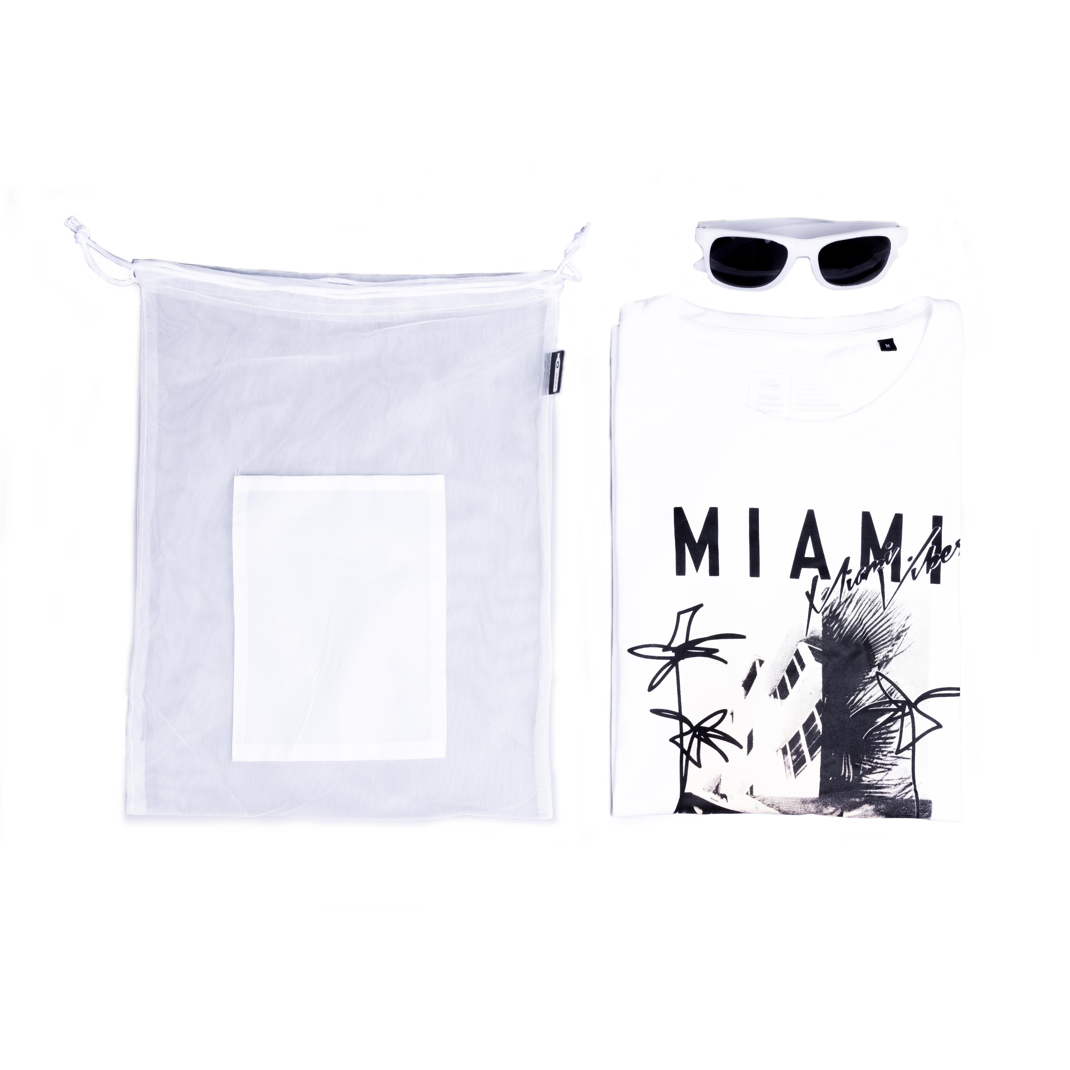 Welcome to Miami! La T-shirt bianca, ampia e leggera in stile "Miami Vibes", ha una particolarità: quando splende il sole, il colore della stampa passa da bianco e nero a colori. Un fantastico effetto UV che fa venir voglia di estate e della prossima avventura.