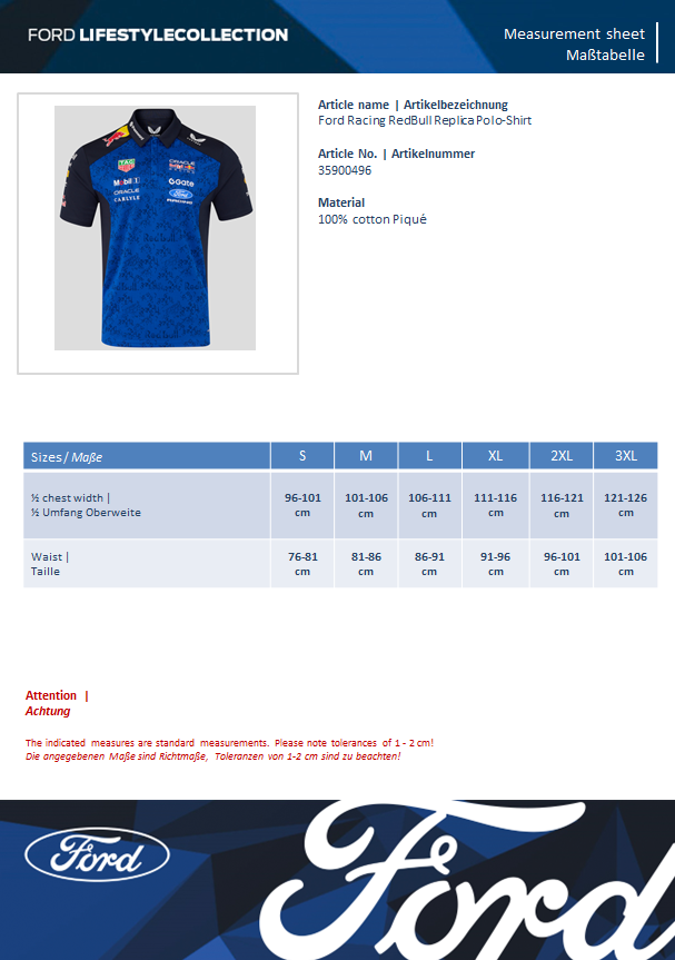 Get race day ready with this Ford Racing Red Bull Replica Polo-Shirt. Engineered with AerTek technology, the breathable fabric provides all-day comfort during every moment. Delivered in a contemporary colourway for a sharp, modern look – featuring bold branding around the top half of the shirt.