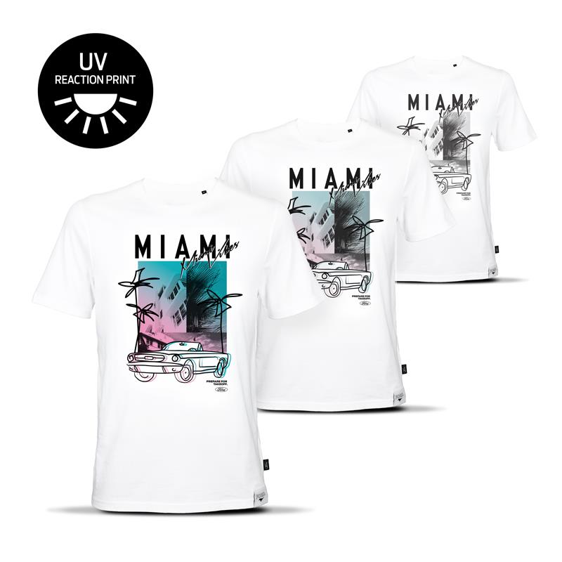 Welcome to Miami! Het witte T-shirt in de luchtige en nonchalante Miami Vibes Style heeft een speciale eigenschap: als de zon schijnt, verandert het zwart-wit van de print in bonte kleuren. Een cool UV-effect waardoor je meteen zin krijgt in de zomer en het volgende avontuur.